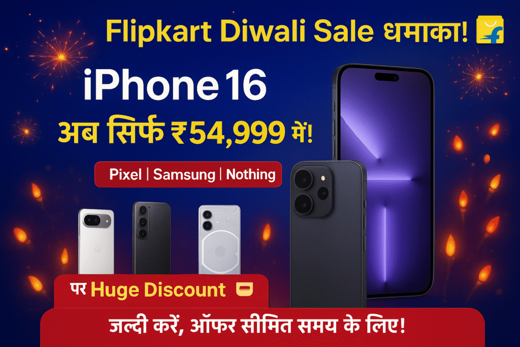 Flipkart Big Bang Diwali Sale 2025 में iPhone 16 ₹54,999 में! Pixel, Samsung, Nothing और Motorola पर जबरदस्त ऑफर्स – जानिए पूरी जानकारी।